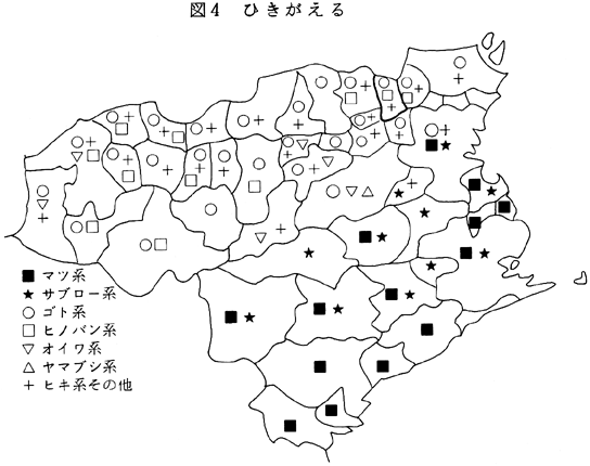 (4)ヒキガエル 「カサゴータ」が最も多く「オンビキ」「ガマ」「ヒノヨージン」が1例ずつあった。 県下のヒキガエルの呼び名は大きく七種の系統がある。その1は座って待つ姿勢から連想したマツ系(マツゴト、ゴトマツなど)。その2は貴人に仕える侍のように侍(さぶろう)からきたサブロー系(サブロー、ゴトサブローなど)。その3はあばたからお岩の連想でオイワ系(オイワゴート、オンバゴートなど)。その4はヤマブシ系(ヤマブシ、ヤキチなど)。その5ヒノバン系(ヒノバン、ヒノヨージンなど)。その6ゴト系(ゴトンビキ、カサゴートなど)。その7ヒキ系その他(オンビキ、オンビキゴート、ガマなど)である。(第4図)