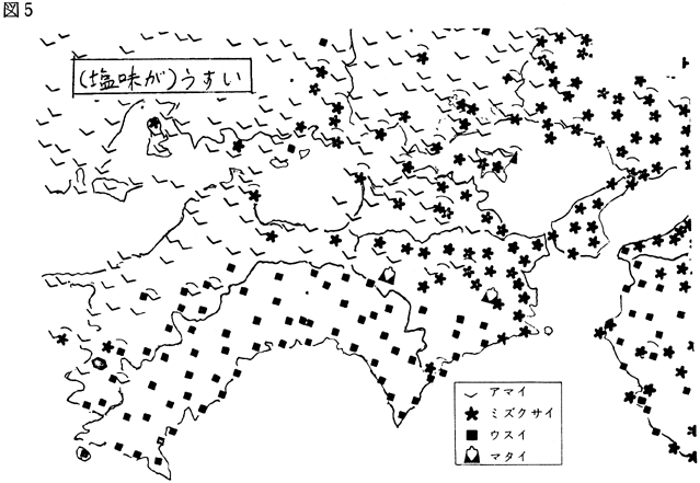 (5)舌 「ベロ」「ベーロ」「ベー」であった。 ベロ、べーロは、関東、西中国、東九州、北四国と全国的に広い範囲の方言である。県下では、吉野川流域から北方が主で上板も当然その圏内となる。南方から高知県は大体「ベラ」である。べーは上板付近と県南に一部あるが、県外には宮崎に一か所見られるだけで言語地図でみた限りは非常に特異な表現である。「シタ」は改まった表現で方言としては近畿、東北、西九州等に広く行われている。 (6)汁がウスイ 「アマイ」「ミズクサイ」で「ダスイ」も聞くという。 第5図ではミズクサイの範囲になっているが、アマイも多く使われる。これは北四国から中国に勢力のある表現である。なお上板では聞けなかったが「マタイ」は言語地図によると全国でも本県のこの2例だけの特異なものである。