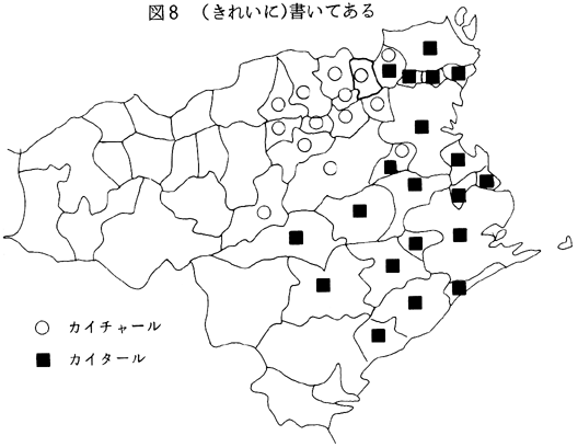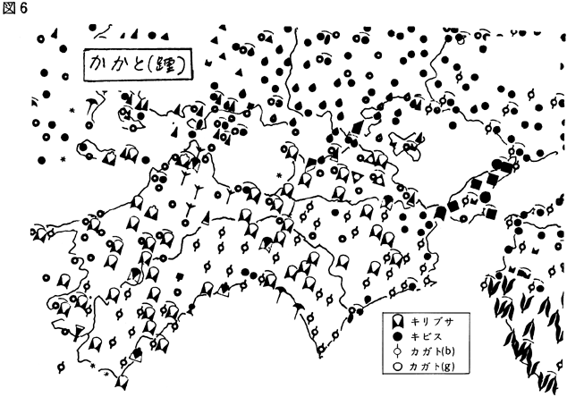 (7)カカト 「キビス」だけであった。 これは第6図と一致する。古くは「キリブサ」が全県をおおっており、ついで「キビス」がはいり、やがて最も新しい「カカト」に代わっていくものと思われる。