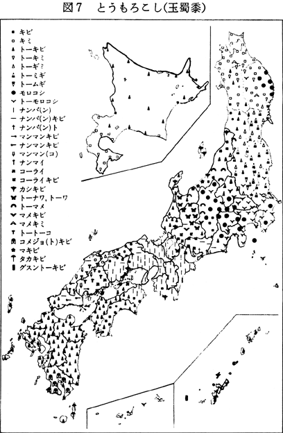 (8)オテダマ 「オジャミ」だけ。 西日本に広く分布する方言であるが四国では愛媛を除く3県で強い勢力をもっている。県下では「イシナゴ」という地域も少しある。 (9)マブシイ 「アマバイ」の地域で「アバイイ」が一例あった。 県下では最も特徴的な表現で、言語地図では、ここと大麻町だけである。周辺の地点は「アマバイ」で、さらに遠くは「アババイ」または「アババイー」である。 (10)ジャガイモ 「ゴーシイモ」「ゴーシューイモ」「カライモ」などがあった。 ゴーシューイモは江州芋かと思われるが、他県では見られない表現である。カライモは普通甘藷をさすが、兵庫県の西南部には馬鈴薯をさす地域も見られるのである。 (11)サツマイモ 「リューキイモ」「カライモ」「ボケイモ」など。 県下全般と同じであるが、リューキイモの方は、本県と愛媛や広島、山口に多く、カライモは高知や、九州とより唐(から)に近い所に分布しているのがおもしろい。 (12)トウモロコシ 「ナンバ」だけである。 ナンバは近畿全域と岡山までが主の方言で県下では徳島を中心とする地域である。県南は「キビ」県西は「トーキビ」が多いようである。(第7図)