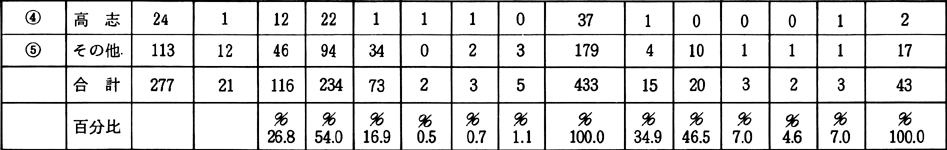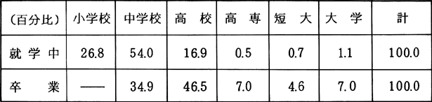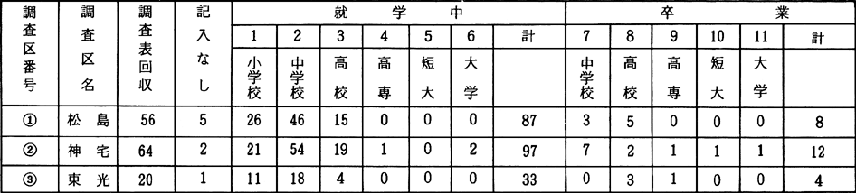 〈調査結果の概要〉 中学生433名に、調査表を配布し277名から回収いたしました。回収率64%でありました。 調査区は、一応、4調査区にわけましたが記入もれが、かなりあり、その他を設けました。全体の数を百分比でみてまいりたいと思います。 1.地域の就学状況 子弟の中の就学中、卒業をおたずねしたわけですが、つぎのとおりでありました。