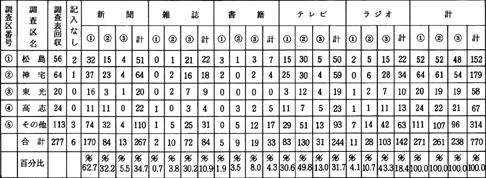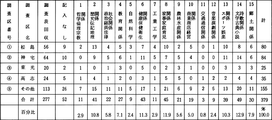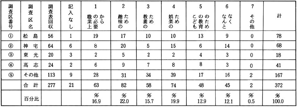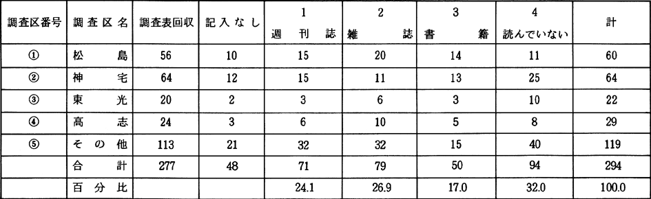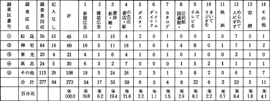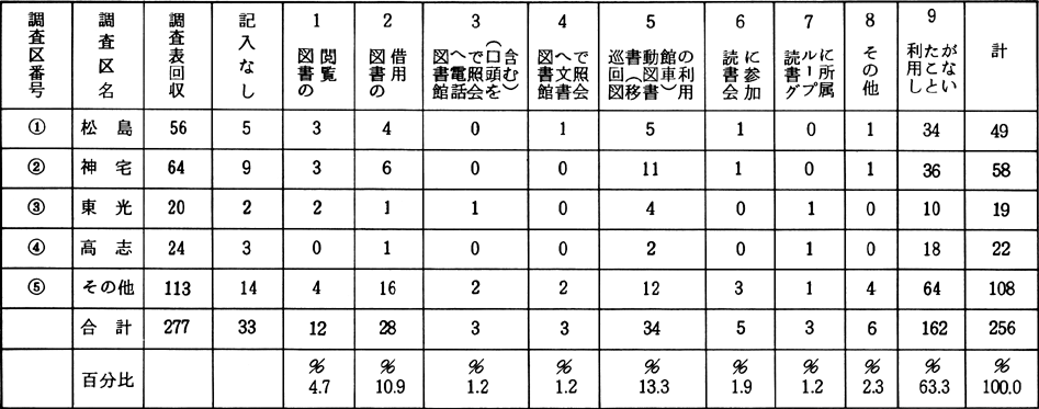 (設問と集計) 読書に関する世論調査 (昭和55年8月1日現在) 徳島県立図書館 調査区番号( )調査区名( ) 〈お願い〉 県立図書館では、読書に関する世論調査を行なっています。この調査は、いろんな面から読書について調査し、その結果は、今後の図書館運営や公民館の読書活動の改善などに役立てるもので、個々の調査表記入事項については秘密を守り、統計上以外の目的に使用いたしませんので、どうか趣旨をご理解のうえ、つぎの問いにお答えを記入してください。(世帯主がご不在の場合は世帯員の方が、また家族ご相談のうえ、記入くださっても結構です。)