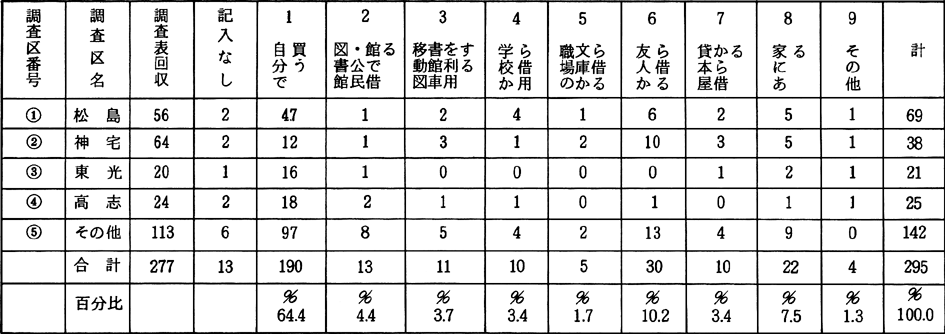 間7.あなたが読みたい本は、おもにどこから入手なされますか。該当する項目の番号を○印でかこんでください。 1.自分で買う 2.図書館・公民館で借る 3.移動図書館車利用する 4.学校から借る 5.職場の文庫から借る 6.友人から借る 7.貸本屋から借る 8.家にある 9.その他( )