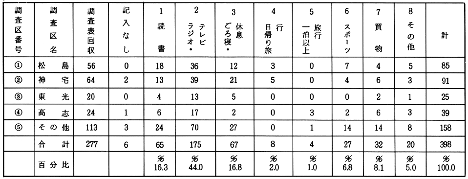 問9.あなたは、余暇をどう過ごしますか。 1.読書 2.ラジオ・テレビ 3.ごろ寝・休息 4.日帰り旅行 5.1泊以上の旅行 6.スポーツ 7.買物