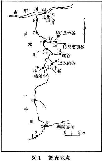 2.調査地点と調査方法 調査は貞光町を流れる主な河川である貞光川とその支流および太田川、吉野川の各河川に、図1に示すように合計20地点を置いて行った。