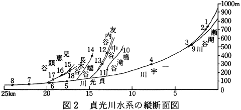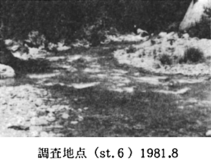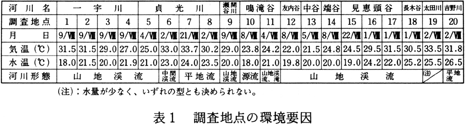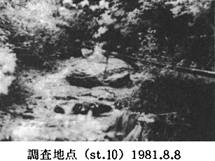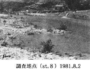 各地点の様相を述べると、st.1(一宇村桑平)は、大小の岩間を清水が流れ落ちる。急傾斜で、流幅の狭い谷と、それに続くゆるやかな流れである。st.2はst.1の100mくらい下流で、ゆるい流れと砂防堤によってできた溜りである。st.3(漆野瀬)は、流速が大きく、河床は人頭より大きな石と岩盤でできている。st.4(須開瀬)は、支流の九藤中川が流入しており、早瀬とそれに続く淵も見られる。両岸は深い谷となり、この溪谷流が、st.7あたりまで続く。st.5(貞光町宮平)、st.6(皆瀬)は、やや深い谷を流れる清水が早瀬を形成する所である。