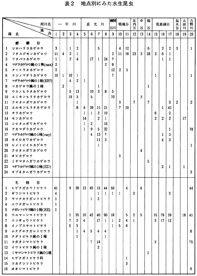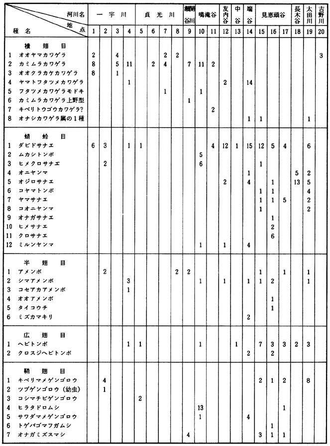 st.11(鳴滝)は、名勝鳴滝の下にできた溜りとそれに続く流れである。st.12は、中谷に流れ込む小さい谷で河床は岩盤と石礫でできている。清水が流れるが河床には荒れが見られる。st.13は、中谷の中流部である。200mくらい上は大きな山崩れで、川底は埋まっている。河床はやや不安定で、水量も少なく、昆虫類の生息に適した所ではない。st.14は、傾斜の急な小さな谷で、河床の荒れが著しい。比較的安定した河床状態の所を探して採集を行った。st.15(家賀道下)は、源流に近い流れで、草木の間にある幅1mくらいの流れである。底質は泥、石礫、岩盤で、両岸は山の斜面である。下流100mのあたりからは、右岸に水田が作られ、潅漑用水としても利用されているようである。st.16(平野)は流幅2mくらいの流れで、河床は石礫、泥からできている。右岸は山の斜面で、左岸は水田となる。平常は澄んだ水が流れるが、降雨があるとたちまち赤土色の泥流となる。 st.17(谷向)は浅い谷で、流れのゆるい所には水生植物もはえ、池の岸部と似た様相を呈する。また、早瀬、淵もあり環境変化に富んだ所である。st.18(長木)は、河床の荒廃が見られ、土石の流入も続いている。昆虫相は食弱であろうと予想された。st.19(太田)は、水枯れに近い状態で、随所にできた溜りを中心に採集した。ここより下流は、両岸と川底がコンクリートで護岸工事された用水となる。st.20(吉野川南岸太田付近)は、早瀬の石礫底を中心にした流れである。丸みのある石が河床を作り、やや不安定な様相である。 調査方法としては、定性採集を行った。各調査地点において、川底の石礫、砂泥を金属製のザルですくい取り、そこに見られる生物をピンセットで取り出した。できるだけ多くの種類を集めるため、調査地点一帯を入念に採集した。