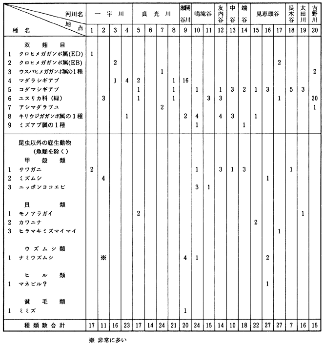 全地点を通して、水生昆虫が8目84種と昆虫以外の底生動物が9種得られた。目別種数では、蜉蝣目が最も多く24種、次いで毛翅目16種、蜻蛉目12種、双翅目9種、■翅目8種、鞘翅目7種、半翅目6種、広翅目2種の順である。蜻蛉類の多いことが注目される。その多くが見恵頭谷で得られている。見恵頭谷一帯は山間部のゆるい流れで、蜻蛉類の生息に適した環境である。 貞光川水系には、水生昆虫が8目81種得られている。キブネタニガワカゲロウとオオシマトビケラは貞光川水系に見られず、吉野川でのみ得られた。このうちオオシマトビケラは、吉野川本流には広く生息し、ヒゲナガカワトビケラと並んで大きな現在量を示し、優占種となる地点も少なくない。支流では今までのところ、伊予川、日開谷川、宮川内谷川、の3河川で生息を確認している。 貞光川本川流で53種、支流で65種が得られた。本川流のみに得られた種が16種、支流のみに得られた種が28種、両方から得られた種が37種である。 採集された水生昆虫の大部分が清水性の種である。やや汚濁に耐えられると思われる種として、コガタシマトビケラ、オオシマトビケラ、アメンボ、タイコウチ、オニヤンマ、コオニヤンマ、コヤマトンボ、ゲンゴロウ科、ガムシ科があげられる。昆虫以外の底生動物の中では、モノアラガイ、ミズムシ、ヒル、ミミズが汚濁に強いものである。これらの個体数、分布地点は少なくそれ程問題にならない。全体的にみると、生物相からは清冽な流れが維持されていると推定される。 地点別に種数をみると、st.2、st.13、st.18では特に少ない。st.2は河床が前に述べたような溜りであるから、生息する種類が限られる。st.13、st.18は河床の荒廃が原因である。蜉蝣類(カゲロウ類)などがわずかに見られるが、毛翅類(トビケラ類)、■翅類(カワゲラ類)はほとんど生息していない。河床の荒廃の著しいst.14も同様で、一部に残ったやや荒れの少ない所にわずかに昆虫類の姿が見られた。一方、貞光川の下流st.7、st.8で20種をこえる種類が得られた。これは、1地点で得られる種数としては多い方である。貞光川下流部が清水性生物のすめる流れであることを示している。 環境庁より自然度を知る指標昆虫に指定されているムカシトンボ(幼虫)は、今回の調査では鳴滝上流域に広く生息することを確認した。 採集例が稀と思われる種として、トゲバゴマフガムシ、オナガミズスマシが採集された。