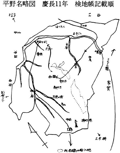 これらの中で、享保の検地との関係で確認できる小字名をたよりに地図上におとしたのが前頁の図である。 この記載順は、享保12年の検地帳の記載順と異なる。特に、夫婦橋付近から大藤までの記載は逆になっている。 これらのことから、慶長11年の検地と享保12年の検地の間には断絶があり、実際に縄打をしたのは、享保12年ではないかと考えられる。平野名では、これ以後寛保3(1743)年、天保4(1833)年の検地帳が残っているが、そのどれも享保12年のものと同じである。おそらく、明治までこの検地を基準としたのではないかと思われる。 そうすると、慶長11年の検地帳は「差し出し」ということになる。この検地帳に「家賀谷」として一括して記入されているということは、慶長11年当時、享保期よりもなお広範にわたる家父長的経営がなされていたことを物語るのではないか。そして、享保期も、明治の地籍図の「平野」よりも広い地域を「平野」としていたと考えられることから、明治期より、より広範な地域が、武田家を中心として経営がなされていたと考えられるのである。 もう一つ、ここの検地の差異は、筆数である。享保の検地の筆数は、平野だけで413あるが、慶長の筆数は家賀(平野名外13名(みょう)を含む)で623しかないことである。