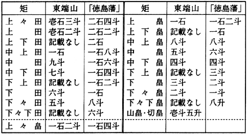 このグラフを見ると、二石以下の者が全体の約60パーセントを占めている。これは、それだけ土地が細分化されていることから考えると自立への配慮だともとらえられるが、これだけの石高では、生活に事欠くはずである。おそらく、より上位の者の手作り地に働きに出たはずである。 反面、10石以上が7名いることは、家父長的経営が残っていることを意味している。このような山村という生産力の低い土地では、この形態を容易に解体することはできないのであろうか。 他と比べて、どのくらい生産力に特徴があるかは、石盛りの比較によって明らかになる。東端山の石盛りは、慶長11年の検地帳の後ろに記載されている。 この石盛りと、福井好行著『徳島県の歴史』120頁に引用されている「徳島藩の石盛り」とを比較してみよう。ただし、ここに引用された石盛りが、どこのものであるかその記述が無いので不明である。