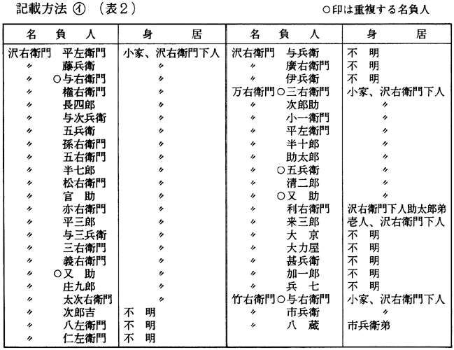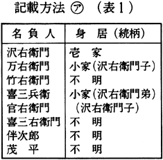 のような記載は、名負人が数名にしぼられる。沢右衛門、官右衛門、喜三兵衛、万右衛門、竹右衛門、伴次郎、喜三右衛門、茂平の8人であり、後は、イ