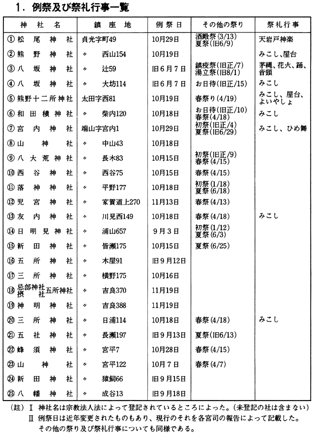 熊野神社 10月19日例祭当日、神輿渡御と屋台の町内巡りがある。部落単位に交代してそれぞれ神輿当家、屋台当屋を定める。当家となった家の門先には神迎えのための聖域を設けるために、太い丸竹の矢来が組まれる。神職は、そこに神の降神を取り持ち祭る。祭礼の後、当家の隣家が当家に集まって直会をする習慣となっている。