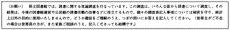 問1.現在あなたのご子弟で就学中の方がありますか。また、すでに卒業されている方がありましたら、該当の項目の数字を○でかこんでください。 就学中(1.小学校 2.中学校 3.高校 4.高専 5.短大 6.大学) 卒業(7.中学校 8.高校 9.高専 10.短大 11.大学) 問2.人間は、社会生活を営むうえにいろいろ新しい情報(知識)が必要ですが、あなたは、その情報(知識)を得られる手段としてつぎのどれによっておられるか、該当のものの頭に○印をつけ、その○の中に、あなたが利用されている順に1.2.3.のように番号をいれてください。 新聞 雑誌 書籍 テレビ ラジオ 問3.県立図書館は、みなさんに情報(知識)を提供するセンターとしての役割りを果たしていますが、あなたまたはご家族のかたの利用状況について、該当のものの数字を○印でかこんでください。 1.図書の閲覧 2.図書の借用 3.図書館へ電話で照会(口頭を含む) 4.図書館へ文書で照会 5.巡回図書(移動図書館車)の利用 6.読書会に参加 7.読書グループに所属 8.その他( ) 9.利用したことがない 間4.あなたは、最近3カ月間に本を読みましたか。該当の数字を○印でかこみ、読んでいる方は書名等を下欄に記入してください。 1.週刊誌 2.雑誌 3.書籍 4.読んでいない