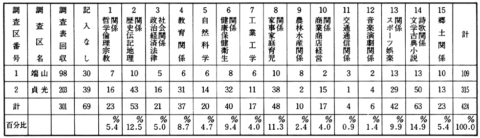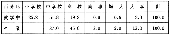 〈調査結果の概要〉 中学生365名に、調査表を配布し301名から回収いたしました。回収率82.5%であります。調査区は端山と貞光にわけて行いました。 1.地域の就学状況 子弟の中の就学中、卒業者についておたずねしたわけですがつぎのとおりです。