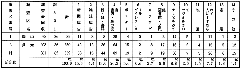 〈はしがき〉 ことしの10月27日から11月9日まで、読書週間があり「本との出会い、ゆたかな人生」という標語で、全国的に読書推進の行事が、開催されました。 当県でも、県立図書館、市町村立図書館が中心となって各種の行事が行われましたが、近年、池田町立、鳴門市立、徳島市立、阿南市立があいついで新築オープンし、本日は、板野郡吉野町に町立笠井図書館が新築オープンいたしまして、徳島県内の公立図書館のネットが徐々にひろがりつつありますのは、よろこばしいところであります。 この調査は貞光中学校の在学生徒の御父兄の方がたを対象に読書に関する世論調査をお願いしましたが、貞光町教育委員会、中学校御父兄、生徒各位の御協力に対し厚く御礼申しあげます。