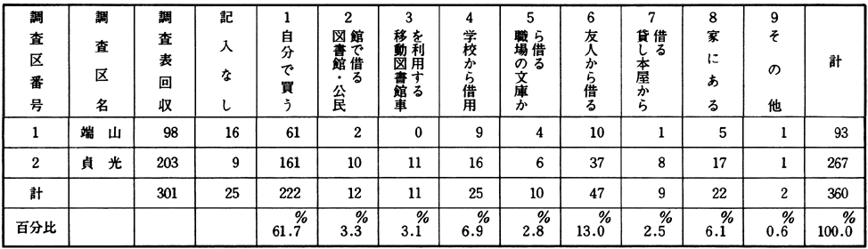 問7.あなたが読みたい本は、おもにどこから入手なされますか。該当する項目の番号を○印でかこんでください。 1.自分で買う 2.図書館・公民館で借る 3.移動図書館車利用する 4.学校から借る 5.職場の文庫から借る 6.友人から借る 7.貸し本屋から借る 8.家にある 9.その他( )