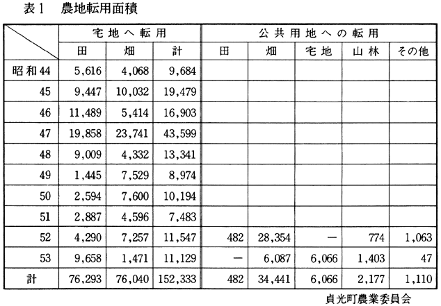 2 貞光町農業の基盤とその性格 (1)貞光町農業の基盤 貞光町の農業基盤をみると、次のようである。貞光町は、急傾斜地の山林原野の占める率が高く、耕地率は11.2%の山村農業地域である。大部分の耕地は、標高200〜300mに分布している。500m以上に分布する農地は少なく、高冷地野菜作農業の振興をはばむ山村農業地帯となっている。傾斜地畑作は、葉たばこの栽培と桑の栽培による養蚕業が中心となって、農家経済を支えている。また山間地農業の振興策として、急傾斜畑地の高度利用の推進のために、果樹園化が進行しつつあるが、労働力不足とあいまって、高収益をあげるには至っていない。主な果樹は、栗、うめ、ゆず、はっさくであるが、はっさく栽培は、先年の寒波により、壊滅状態にある。水田率は18.9%で、吉野川沿いの低地部と貞光川沿岸の中山地に棚田が小規模に展開しているだけであって、水稲の生産は低い。この水田経営規模は一農家当たり11.9aとなって、ほとんどの農家が自給生産の状態にある。平地水田地帯は、近年都市的土地利用が進展し、宅地等への転用が増加している。(表1)都市計画道路等の開発や河川改修と基幹道路の計画実施により、さらに水田の減少化が著しく進むことになろう。貞光町は、古くから貞光川が吉野川と合流する地点に、背後の集落と結びついた商業機能地域を形成しており、食品加工工場とともに、地域住民に就業の場を提供してきた。また、交通条件に比較的恵まれていることもあって、農家の兼業化を著しく進行させている。昭和55年の専兼業農家数は、総農家数915戸に対し、専業農家187戸(20.4%)、一種兼業農家214戸(23.4%)、二種兼業農家514戸(56.2%)となっている。昭和40年に比べ農家数は23.9%減少している。専兼業別の変化では、専業、一種兼業が減少し、二種兼業が増大している。農業経営基盤の弱体化とともに、山村農業地域に一般的である二種兼業化が進行し、農業構造再編が強くのぞまれている。このような状況の中にあって、農業生産の変化に大きい影響を及ぼすことであろう事業計画が推進されようとしている。柴内地区南部山間地の開発パイロット事業である開発計画地区は、標高400〜500mで、準高冷地農業地に該当して、野菜作りをはじめ総合農場としての機能を有するため、その開発が期待されよう。