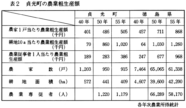 以上のように、貞光町の農業基盤は、山間地傾斜畑地における葉たばこ、桑と養蚕業を中心作目としてきた。農工間所得格差の増大が農家経済規模を縮少させる中で、二種兼業化が一般化した。このような中にあって、平坦地農業地区では少数農家がハウスイチゴの栽培に取り組み、山間地農業地区では、ゆず・すだちの栽培に経営方向を転換するなど、商品生産農業の育成が進められている現状にある。 (2)貞光町農業の性格 貞光町農業の性格を、各種統計によってみてみると次のようである。昭和40年の農業粗生産額は330百万円であったが、55年には4.8倍の1,599百万円となっている。農家1戸当たり農業粗生産額は50.5万円で、徳島県の86.8万円の58.2%となって、県平均より顕著に低く、農業経営規模の小さいことを示している。土地生産性は、10.2万円で、徳島県の12.6万円の81.0%となって、県平均より低い。労働生産性は38.6万円で、徳島県平均の96.8万円の39.9%となって、著しく低い。このように、土地生産性、労働生産性の低さが、貞光町農業の性格を表す一端となっている。また、1農家当たりの生産規模の零細性を物語るものでもある。昭和40年から55年にかけての農家数の減少が24.0%であったのに比べて、耕地面積では昭和40年の574haに対して、昭和55年には70.1%と約30%減少し、409haとなっていることなども農業経営の零細性をもたらしたものと思われる。(表2)