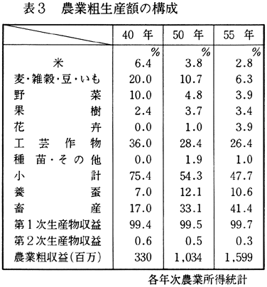 昭和55年の作目別農業粗生産の構成については、表3に示すとおりである。