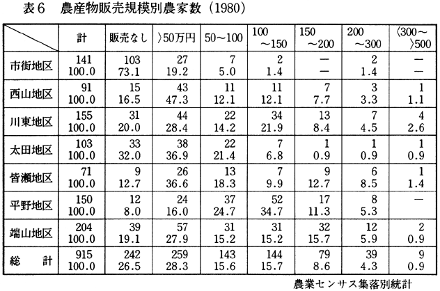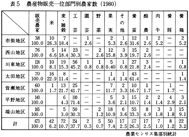 総農家数は915戸で、専業・兼業農家の比率をみると専業農家20.4%、1種兼業農家23.4%、2種兼業農家56.2%になっている。専業農家に1種兼業農家を加えても農業比重の高い農家は43.8%と半数以下となっている。昭和40年との比較でみると、専業、1種兼業・2種兼業それぞれの比率は、34.2%、32.0%、33.8%で、昭和50年には、13.9%、27.6%、58.5%となって、50年に専業農家がもっとも著しい減少を示し、2種兼業農家が総農家の過半数以上の58.5%に達した。その後、55年には、専業農家が6.5%の増加で、2種兼業農家が2.2%減少したものの、2種兼業化の比重はきわめて高いものとなっている。 農産物の販売1位の部門農家数を表5に示した。