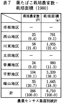 3.貞光町における商品生産農業 (1)工芸(葉たばこ) 貞光町の葉たばこの栽培の歴史は古く、山間地農業地域の農家経済に大きく貢献してきた。昭和55年の栽培農家戸数は266戸、作付面積87.10ha、粗生産額264百万円で、農業総粗生産額に占める割合は26.4%である。 葉たばこは、山間地急傾斜畑地に在来種の阿波葉を主に栽培されてきたが、近年減反の傾向にある。この理由は、在来種であるために、生産の作業過程の大半が人的労働力を必要とするにもかかわらず耕作者の高令化が進行し減反をよぎなくされている。近時、省力栽培の可能な在来種に代わり、黄色種が導入された。しかし黄色種の栽培は、作付面積の割当てが増加されないこともあって、栽培面積は、在来種の80%に対し、黄色種は20%にとどまっている。葉たばこ栽培農家と収穫面積の分布をみると表7に示すように、平野地区(1)に栽培農家がもっとも多い。平野地区の農業集落は、胡麻平・平野・家賀・中山・長木・広谷の各集落から形成されているが、栽培農家は、家賀集落に集中しており、貞光町の葉たばこの主要産地を形成している。