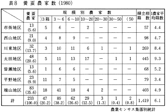 とくに、家賀集落は、貞光町の山間地農業の中心となっている。栽培面積も総面積87.10haの38.3%に当たる33.39haで、1農家当たり32.1aである。次いで、川東地区(2)の58年(21.8%)、19.55ha(22.4%)となって、1農家当たりの栽培面積33.7aである。地区内でも柴内・白村の両集落が葉たばこの栽培農家が多い。さらに端山地区(3)では55戸(20.7%)、16.45ha(18.9%)で、1農家当たりの栽培面積29.9aである。この3地区で栽培農家の81.6%を占めている。栽培面積では、総面積87.10haの79.7%となっている。その他の地区では、栽培農家の戸数と比率からみて分散的である。 以上のように平野地区・川東地区・端山地区に葉たばこ栽培が集中している。これら3地区ともに山間地傾斜地に立地し、葉たばこ専業農家は少なく、葉たばこ栽培を中心に、畜産・養蚕との複合経営農家が多い。 (葉たばこ栽培農家の実態) 事例農家の実態を述べよう。葉たばこ専業農家は少なく、他部門との複合経営により農業収入を安定させている農家が一般的であるとする貞光町農業の特性をふまえた上で、事例農家をとり上げた。 平野地区のM農家は、葉たばこ栽培とブロイラーの飼育との複合経営による専業農家である。葉たばこ栽培面積33aとブロイラーを年間で10,000羽出荷している。労働力は、夫婦と祖母の3人である。葉たばこの年間作業は、4月10日頃に、長瀬の種苗センターから苗を引き寄せ、苗床に仮植し、4月下旬から5月初旬にかけて定植をする。とくに前作の麦畑の中に定植するほうが病気に強いこともあって、一般的に麦刈り前に麦畑に定植されている。労働力の関係もあって麦の栽培が敬遠されている栽培農家もある。7月10日から8月20日頃までに収穫され、天日乾燥したものを1ケ月程貯蔵し、色・形により5段階に選別し、12月上旬から下旬にかけて出荷する。このような作業過程が在来種の一般的作業過程である。作業の中でも土寄せに要する労働時間は、短時間であるが7月10日頃から8月20日頃にかけての収穫、乾燥、選別期には、1日10時間以上の労働となり、かなり多忙を極めるようである。 このような多労働型の葉たばこ栽培との労働力競合をさけて、M農家では7年前からブロイラーの飼育を始めている。オールイン、オールアウト方式により、集落一体化の生産体制が取られ、ひな鳥を入れて70日で出荷している。これらのブロイラーは食品加工企業と農家との間に最低価格の保証制度が成立しており、万一、病害虫の発生によって、飼育ブロイラーの商品価値が下がったとしても、農家にとって不利益にならないようになっているようである。飼料から出荷まで企業に委ねられたブロイラーの生産は、山間地農業の近代化への進展とみることができるとともに、安定した葉たばこ栽培の補完作目であるように思われる。 (2)養蚕 養蚕業は、吉野川中・上流域の山地性の強い性格を有する農業の中にあって、主要な商品生産農業である。とくに徳島県の養蚕業は、葉藍の衰退後に吉野川流域に広く分布した農業経営部門である。戦後の一時期絹市場の暴落によって衰退化の過程をたどったこともあったけれども、近時天然繊維のみなおしとともに、再び生産の強化が図られているようである。 貞光町の養蚕農家率は25.5%で、県平均養蚕農家率6.2%に比べて、貞光町での養蚕比重の高いことがうかがわれる。養蚕農家の分布をみると表8に示したように、端山地区83戸(35.6%)太田地区(4)48戸(20.6%)、川東地区32戸(13.7%)、平野地区23戸(9.9%)、西山地区(5)21戸(9.0%)、市街地区(6)・皆瀬地区(7)の13戸(5.6%)と順次構成比を低下させていく。