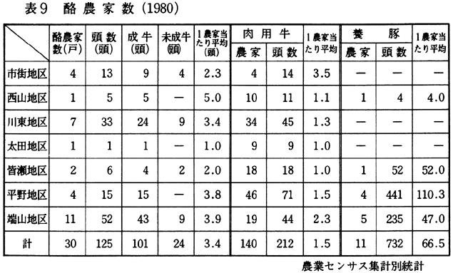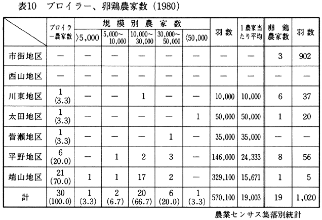 その分布を表9によってみると、飼養農家が多く飼育頭数も多いのは端山地区で、次いで、川東地区となっている。町平均飼育頭数の42頭以上の地区は、西山地区、端山地区、川東地区であるが、酪農集中地区はなく分散的である。酪農専業農家の数は少ないが、他部門との複合経営による専業的専農家の方が多い状態にある。 ロ、ブロイラー飼養農家 ブロイラーの飼養農家数は、昭和40年には、6戸の飼養農家に3,400羽のブロイラーが飼育され、全農家に対して0.5%の飼養農家率にすぎなかったが、昭和55年には、飼養農家数では30戸、飼育羽数では570,100羽へと拡大している。 表10は、地区別に飼養農家数と飼育羽数を示したものである。端山地区・平野地区の山間地農業地帯を主体とし、川東地区・太田地区・皆瀬地区にそれぞれ1飼養農家があるだけであり、市街地区・西山地区には、飼養農家はない。葉たばこ栽培、酪農業の中心地域と一致している。規模の面では、太田地区の5万羽以上飼育が首位となるが1農家にすぎない。 ブロイラー飼養農家の全てが商社との契約飼育のため、価格の最低保証はされるが、1羽当たりの収益性は極端に低い。このため各飼養農家では、必然的に多羽飼育の方向をとり、規模拡大化の傾向をみせている。 (畜産農家の事例) 酪農とブロイラーを経営する端山地区のK農家と酪農と施設園芸を経営する市街地区のM農家の事例を述べる。 端山地区のK農家は、兼業農家で、農業労働は、婦人と祖父の2人である。婦人が主にブロイラーの飼育、祖父が酪農を分担している。 乳牛は5頭を飼育し、内3頭が成牛で搾乳をしている。搾乳量は1日60kgで、朝夕2回搾乳して森永ミルクヘ出荷している。 とくにK農家では自給用飼料作物の不足が大きい問題となっている。とくに山村酪農であるため、飼料作物畑の規模拡大ができないこともあり、配合飼料にたよっている現状にある。 ブロイラーは、昭和50年より飼育をはじめ、現在5,500羽を飼育している。年間4回の出荷であるが、この出荷時がいちばん人手を要することもあり、集落内の共同出荷体制をとることで、労働不足を解消している。 M農家は、水田48a、草地50aを所有し、若夫婦は農外産業に従事しているため老夫婦2人の主労働力で5頭の乳牛を飼育している。酪農は昭和25年から始めているが、30年にミルカーの導入があって、搾乳時の労力が省力化されている。搾乳量は1日100kgで、森永ミルクヘ出荷している。 昭和50年より、役場産経課と農業普及員の指導によりハウスイチゴの栽培を始めている。栽培面積は10aで、ハウスビニールを三重にするなどの方法をとり、ハウス保温に努め、12月10日頃から徳島市場へ出荷している。県西部地区でのハウスイチゴの栽培発生の地として評価されるが、栽培農家は3戸と、地域分化がなされなかった。現在、対岸の美馬町にハウスイチゴ栽培農家の広がりがみられるようである。
