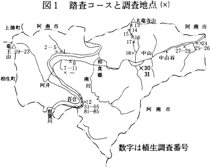 調査期間に踏査したコース及び調査地点は図1に示すとおりで、太竜寺山・竜王山をはじめ、南川、百合谷、阿井川、那賀川筋など、調査可能な範囲で踏査し、41地点で植生調査を行った。