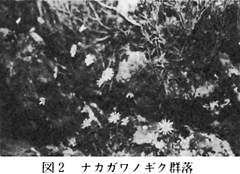 その結果を植物社会学的手法により表操作し、総合常在度表を作成した(付表1)。また、現地での群落確認により現存植生図を作成した(付図)。 本町において識別できた群落は、次のとおりである。自然植生としてナカガワノギク群落、代償植生としてヒメガマ群落、シイ・カシ萌芽林、アカマツ群落、コナラ群落、スギ・ヒノキ植林、モウソウチク林などである。 1 自然植生 (1)ナカガワノギク群落 ナカガワノギクは那賀川流域の河岸を中心に分布する本県特産の種で、鷲敷町を流れる那賀川の河岸には、全域にわたって生育しており、特に河岸に露岩のある場所に多い。