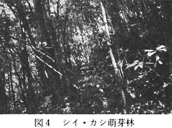 シイ・カシ萌芽林は西部地域に多く、特に土佐町及び仁宇の対岸にかなり広い面積を占めている。また南部地域では百合谷周辺に多く、それ以外の場所では小面積の群落が点在している。土佐町の北岸山地で調査したこの群落は、高木層の高さ12〜18m、高木層の植被率が90〜100%で、常緑広葉樹のため林内に光があまり入らないので、草本層は発達が悪しく植被率5〜20%となっている(付表4)。 本群落はコジイ、ヤブムラサキ、マメヅタ、マルバウツギ、サネカズラ、ヤマザクラ、マンリョウ、ヤブランで識別され、平均出現種数36.2種。なお、町内の社叢林の中には八坂神社のように発達したシイ林が残っている所もある。 (4)アカマツ群落 現在、アカマツ・クロマツは全国的規模で枯れているが、本町のアカマツもその例外でなく、ここ数年来、アカマツの立ち枯れが目立ちアカマツ群落が激減した。