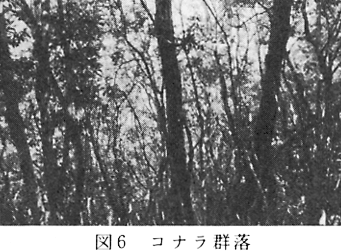 昭和53年の空中写真によって本町の群落区分をすると、アカマツ林の面積はかなり広いが、現地で確認すると、そこがシイ・カシ萌芽林やコナラ林など、他の群落に変わってしまつている。これはマツクイムシの被害により高木層のアカマツが枯れ、亜高木や低木の樹種が代わって林冠を形成してきたからである。調査中にも枯れたアカマツを搬出している現場に出あった。このようにアカマツ林が次第に無くなっていく中において太竜寺山下の海抜380〜580mの所のアカマツ林では胸径40〜80cmのものもあり、ここではほとんどマツクイムシの影響をうけていなかった(付表5)。 この群落にはアカガシ、ウラジロガシ、アラカシ、コジイなどを含み、シイ・カシ萌芽林としての要素を多くもっている。従って高木層のアカマツが枯死すれば、相観的にシイ・カシ萌芽林になる可能性は高い。またモミが高い頻度で出現しているのも、特徴の一つといえよう。この群落はアカマツ、コバノミツバツツジ、アカガシ、ウラジロガシ、コツクバネウツギ、ウラジロノキなどで識別され(付表5参照)、平均出現種数35.6種である。 (5)コナラ群落 コナラはシイ・カシ萌芽林にもアカマツ林にも出現するが、ここでコナラ林というのはコナラの優占度及び出現頻度が高い林である。本町では、海抜高度の高い竜王山系の尾根近くにごくわずか見られるだけである。