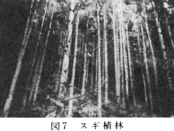 本町は、前述のとおり、徳島県内でも気温が高く、降水量も多い方で、気象条件としては、植林したスギ、ヒノキの生長には適している。また、山は多いが海抜高度もそれほど高くなく、人家から近い里山であることなどにより古くから人手が加わり、植林の占める割合が多く、町林野面積の83%にも達する。県全体の植林面積の割合は62%であるので、これをはるかに超えている。 調査したスギ林はかなり手入れされており、高木層に樹高約18m胸径約40cmのスギがみられ、亜高木層を欠き、低木層にヤブツバキ、ヒサカキ、コガクウツギ、アラカシ、イヌビワなどが散在し、草本層にウラジロ、キジノオシダ、ジャノヒゲ、チヂミザサ、フユイチゴなどがみられた(付表7)。 スギ植林及びモウソウチク林などのように、継続的に人工が加えられている植生は、チヂミサザ、ゼンマイ、ドクダミ、ヒメドコロ、ヤマジノホトトギス、ツタなどで、シイ・カシ萌芽林、アカマツ林、コナラ林などの二次林と区別される。そしてスギ林は、スギ、ノブドウ、ジャノヒゲ、ホドイモなどでモウソウチク林と識別される。平均出現種数42.0種。 (7)竹林 本町のモウソウチクの作付面積は44haで、阿南市1130ha、小松島147haに次いで県下で3番めに広い面積である。中山川の中山、助友、下司名、日ノ浦及び小仁字に多くみられる。