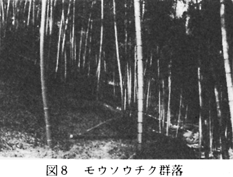 中山川の最上流の調査地では、高さ10〜13m、胸径11〜12cmのよく生育したモウソウチクが林立し、林床にはクサイチゴ、ハシカグサ、ミズヒキ、フユイチゴ、ノササゲ、クサマオ、オニドコロ、アキノタムラソウなどが散生していた(付表8)。 群落識別種は、モウソウチク、クサイチゴ、タラノキ、ハシカグサ、タチツボスミレ、マダケ、ミズヒキ、イタドリなどで、平均出現種数35.6種である。なお、那賀川の両岸には、細長く帯状にメダケが分布しているが、松ノ木の南、国道下の海抜74m地点のメダケ群落の主な構成種は、メダケ(5・5)、トサシモツケ(2・2)、ノイバラ(1・1)、ヒガンバナ(2・2)、ナカガワノギク(1・1)、ススキ(+2)、タンポポ(+)、スイバ(+)、ヤブツバキ(+)、ヨモギ(+)、イヌガヤ(+)、クズ(+)、フジ(+)、キシツツジ(+)、キレハノブドウ(+)、ミツバアケビ(+)、イヌガヤ(+)などである。 (8)樹園地 本町の樹園地では、ミカンなどの柑橘類が39ha、クリが13haの面積を占め、その外にウメ、カキなども栽培されている。これらの主な産地は北地・中山・小仁字などである。 (9)田畑 和食、学原、阿井、石橋など、那賀川ぞいの平野部に水田や畑がみられる。本町の水田の面積は200haと広く、畑は18haでキウリ、ナス、ピーマン、カボチャ、イチゴ、ダイコン、キャベツ、ハクサイ、ホウレンソウ、サトイモ、ネギ、ニンジン、ゴボウなど、多くの野菜が栽培されている。