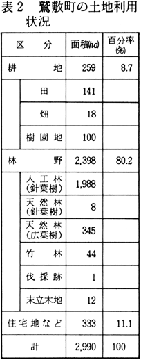 IV 調査結果とその考察 鷲敷町の土地利用状況は、耕地と住宅地などを除く林野面積が2398haで、全体の80.2%にあたり、そのうち人工林が82.9%、コナラ林、シイ・カシ萌芽林、アカマツ林などを合わせて14.7%である(表2)。
