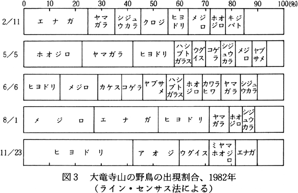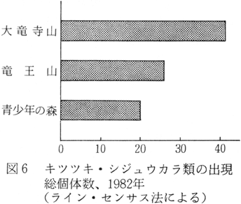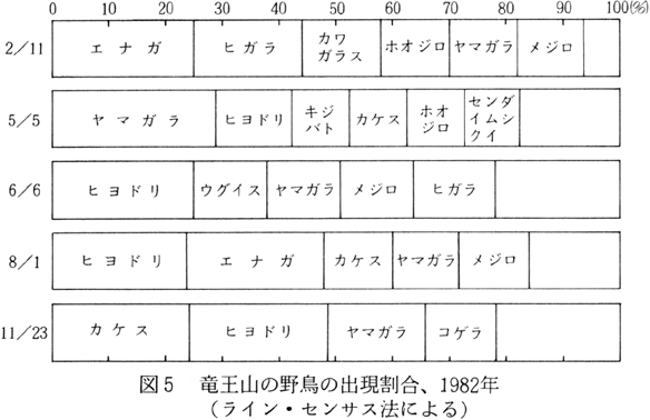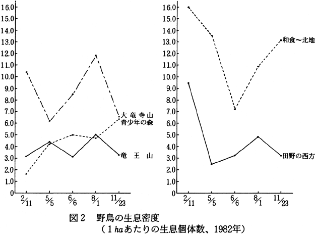 a)自然環境 3か所とも大部分がスギ人工林である。 b)ライン・センサス法による調査の標高 大竜寺山……110〜430m 青少年の森……100〜300m 竜王山……70〜660m c)生息鳥類(当地で繁殖するもの)