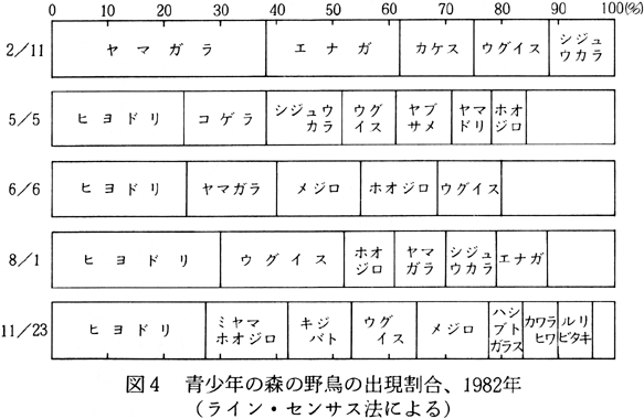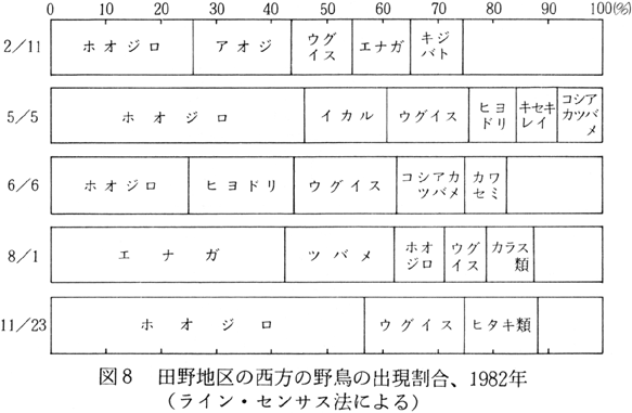 ライン・センサス法とは、調査コースを時速2kmで歩行し調査者から半径25m以内で観察された鳥の種類と個体数をすべて記録していくものである。これにより、その地区における野鳥の生息密度と優占種のおおよそがわかる。それ以外で観察された種類については、その地域の鳥類相の概略をつかむ上で必要と思われるものについて適宜記録していった。上記の5か所以外の地域でも必要に応じて調査を行った。 3 調査結果 ライン・センサス法により得られた、各調査地区別の野鳥の生息密度(1haあたりの生息数)を、図2に、また各地区別の野鳥の出現割合を図3〜図5と図8・図9に示した。