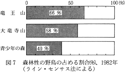 次に、ライン・センサス法により得られた野鳥の種類を、森林性と、非森林性のものとに分け、それらの総個体数の割合を場所別に分けて比較してみる。(図7)