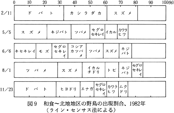 特に、冬期に生息密度が高くなっているが(図2参照)、これはドバトが非常に多いためである。ドバトは、中央〜西アジア原産のカワラバトのことで、国内では、飼育されていたものが逃げ出して野生化している。環境の変化に対する適応力が非常に強く、橋の下や、コンクリート建物のすきまなどに営巣し、人為の影響の強い農耕・村落・都市部では次第に数が増えつつある。農作物に被害を与えるのは、ほとんどがこのドバトであるが、この鳥は、人間による自然の改変が進めば進むほど、その生息適地が増え、ますます増殖するという皮肉な存在である。 しかし護岸工場されていない自然状態に近い河川では、カワセミが留鳥として生息し、キアシシギ・ササゴイも記録された。 (6)その他 1 アオバズク