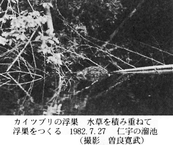 鷲敷町内で比較的大きな4つの溜池を調査したところ、仁宇の溜池で、カイツブリの生息繁殖を確認した。山合いの溜池での生息は珍しく、貴重な生息地である。コンクリート護岸でなく、自然な岸辺であるので生息繁殖が可能なのである。