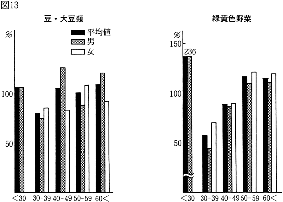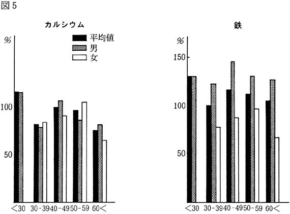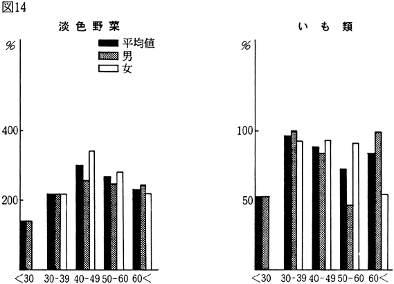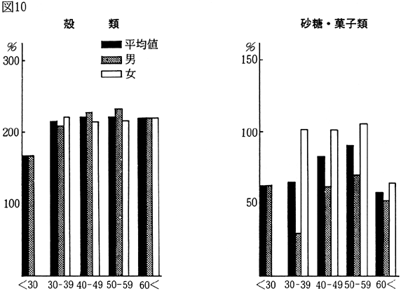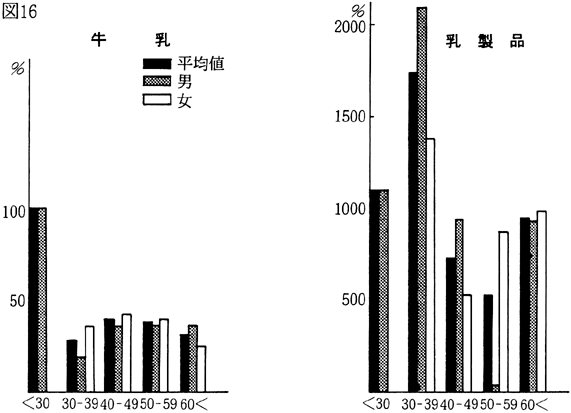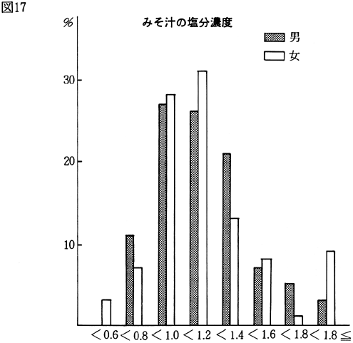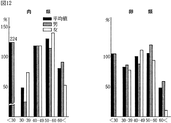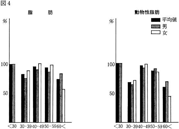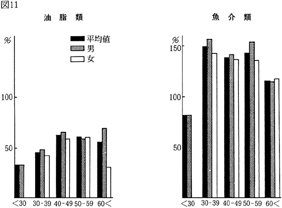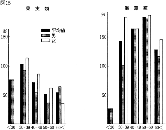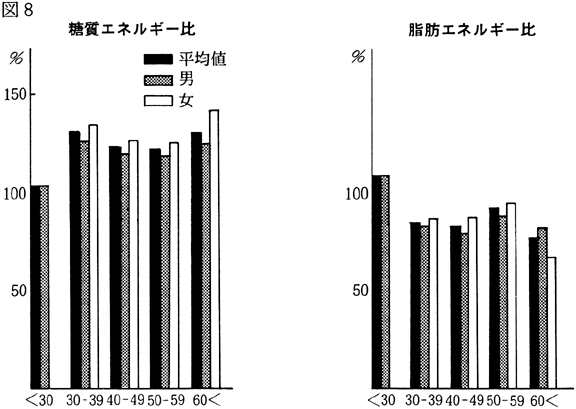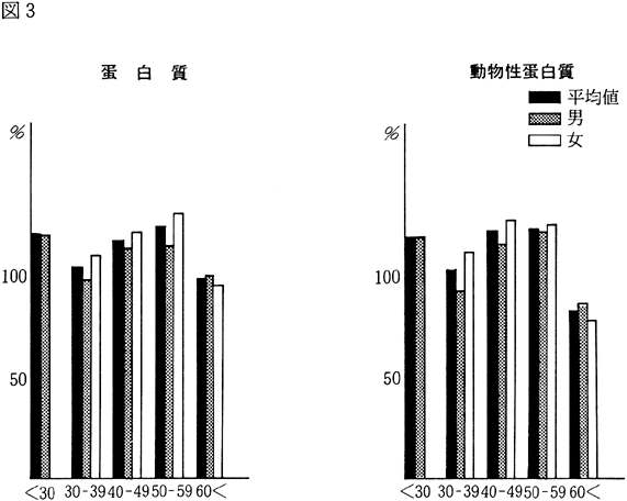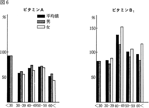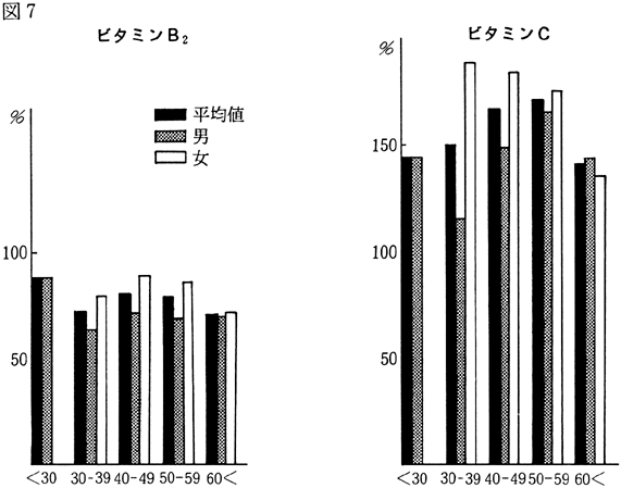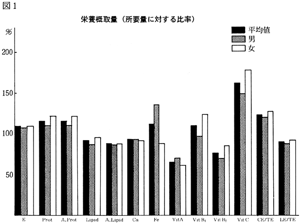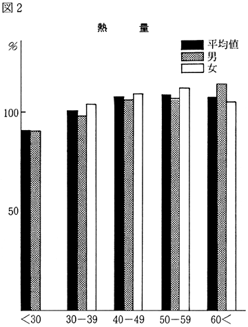〈結果および考察〉 1)栄養摂取量 栄養摂取量を農耕従事者の1日あたりの栄養所要量に対する比率としてあらわすと図1の如く、基準量を充足しているのはエネルギー、蛋白質、動物性蛋白質、鉄、ビタミンB1、Cで、基準量以下のものは脂肪、動物性脂肪、カルシウム、ビタミンA・B2である。全エネルギーに占める糖質エネルギー比(CE/TE)は高く、それに反し全エネルギーに占める脂肪エネルギー(LE/TE)は低い。これは、典型的な農村的食物体を示しているが、調査期間が夏季であったことを無視することはできない。 2)年令別にみた栄養摂取量(図2〜8) 熱量は全世代を通じて所要量を上回っていたが(図2)、摂取エネルギーを生活時間調査から得られた消費エネルギーと比較すると男性では0.9、女性では0.95と消費エネルギーが摂取エネルギーを上回っていた(表1)。蛋白質は全年令を通じてほぼ充足されていたが(図3)、動物性脂肪では比較的低値を示し、とくに30才代、60才代で摂取量が低くなっていた(図4)。鉄は男女差が著しく、女性の摂取比率がかなり低くなっている(図5)。ビタミンA・B2は全世代を通じて所要量を下回っており、本調査における栄養素群の中で最も不足が目立っていた(図6、7)。全年令を通じて糖質エネルギー比は比較的高く、脂肪エネルギー比は低値を示した。 3)食品群別摂取量 鷲敷町住民の食品群別摂取量を、性、年令、身長、体重、労作強度を考慮した食糧構成基準を100%として比較すると(図9)、殻類、淡色野菜、海草類、乳製品の摂取が高く、また魚介類も比較的多くとっている。しかし油脂類、果実類、牛乳の摂取が低くなっていた。淡色野菜摂取の非常に高いのは、その内訳でほとんど西瓜で占められていたためと思われる。 4)年令別にみた食品群別摂取量(図10〜16) 食糧構成基準を100%として各食品群の摂取量を性別、年令別に比較すると、殻類は各年令層を通じて基準よりかなり高く男女差はみられなかった。油脂類については全年令とも低くなっていた。魚介類については鷲敷町が山間部に位置しているにもかかわらず全年令層で基準を上回っており、スーパーなどの進出による流通の改善が大きな要因をなしているものと思われる。これは鷲敷町において魚介類からの蛋白補給が重要な位置を占めていると考えられ、低脂肪で良質の蛋白質を含んでいるため、良い傾向と思われる。肉類および卵類については30才代と60才代の摂取が低くなっていた。緑黄色野菜については30才代、40才代での摂取が低く、これが先に述べたビタミンAなどの不足の大きな原因をなしているのではないかと考えられる。海草類は全世代を通じて高い値を示した。わかめがNaの吸収を阻害するという報告もあることより、高血圧予防のためにもよい習慣と思われる。牛乳の摂取は全世代を通じて著しく低く、カルシウム、ビタミン不足の改善のためにも牛乳摂取の増加が望まれる。 5)食品の摂取頻度のアンケート調査結果(表2) 調査が一日の栄養摂取であったため食生活の全貌をとらえるべく、アンケ−トによる食品の摂取頻度を調べてみた。頻度の平均値はその食品を一日何回食べたかを表している。米2.96回、漬物2.06回と食べる回数が多く米を中心とした農村独特の食形態であることがうかがえた。しかし、野菜、海草類は1.84回、0.67回と比較的頻繁に摂取されており望ましいことと思われる。少なくても1日1回摂取すべき肉類、乳製品は、0.41回、0.58回と前述の調査結果と一致して低く、栄養改善の面から摂取の増加が望まれる。 6)味噌汁の塩分濃度(図17) 大部分において標準値の1%を超えている。中には1.6%を超えるものがあり、アンケート結果からわかるように漬物の摂取頻度も高く、食塩摂取に対する栄養指導が必要であろう。 7 栄養に対する意識調査(図18) 栄養に対する意識をアンケートにより調査した結果、人参、ほうれん草などの緑黄色野菜をよく食べますかという質問に対して、半数以上が“はい”と答えているが、調査結果からは緑黄色野菜の摂取の低い結果になっている。
