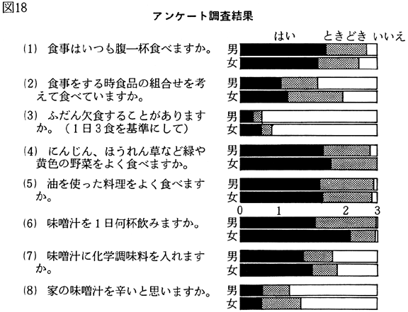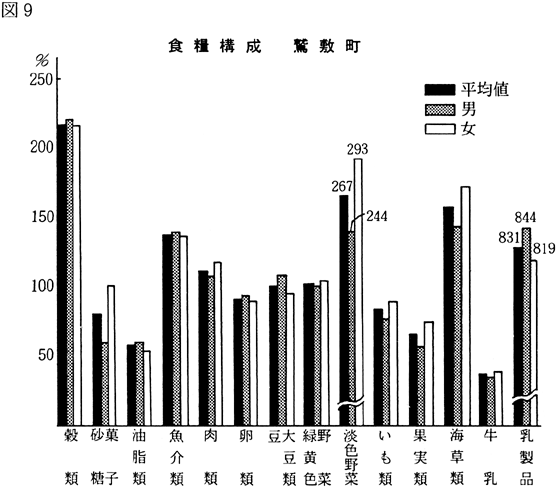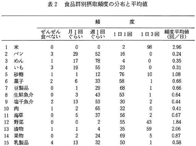 〈まとめ〉 調査時期が夏期であったが比較的バランスのとれた食生活がなされていた。しかし、ビタミンA・B2の不足がみられ、ピーマン、南瓜、人参などの緑黄色野菜、牛乳、肉を摂取することが必要であろう。また漬物や醤油の摂取頻度も高く、高血圧、脳卒中予防のためにも塩分摂取をひかえることが肝要と思われる。