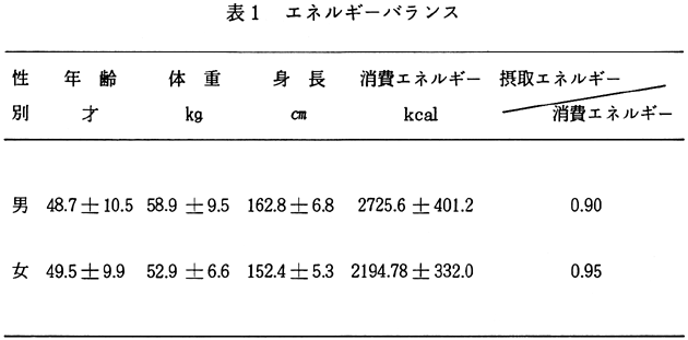 〈調査方法〉 1)対象 徳島県那賀郡鷲敷町、鷲敷農協に加入している農業従事者のうち、男105名、女105名の計210名について下記調査を実施した。年令は20才代から60才で平均男48.7才、女49.5才であった。 2)期間 昭和57年7月28日から7月31日までの4日間にわたり実施した。 3)調査項目 a)栄養摂取量 調査を行う数日前に食事調査表を各自に配布し、調査日の前日に摂取した食物の種類と目安量を記入してもらい、調査日に持参するよう依頼した。調査日には個々の面接により食品モデルを提示し、各自が記入した食品目安量を調査員が再確認したうえでグラム数に換算した。栄養素摂取量および食品群別摂取量などの算定には、国民生活センター(東京都港区高輪三丁目13の22)の電子計算機を使用した。 b)生活時間調査 食事調査日の生活時間を記入してもらい、面接時に調査員が不明瞭な点を再確認し、生活時間の推定を行った。消費エネルギーは、沼尻らの方法を用いた。各労作の活動代謝は以前の報告と同様の値を用いた。 c)味噌汁の塩分濃度 全研社製の食塩濃度計により塩分濃度を測定した。 d)栄養意識と食物摂取頻度 栄養意識と食物摂取頻度調査には各アンケート用紙を各自に配布、記入を依頼し、面接時に調査員が不明確な点をもう一度説明した上で、各解答を得た。各表の作成には山上ら、藤沢ら、細谷らの方法を参考にした。
