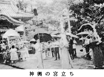 掃き浄められた坂道の参道を上りつめると、祭礼提燈などで飾られた御社頭に着く。境内の広場にダンジリが一台、「トン コチ ココチン トン ……」と祇園ばやしの太鼓の音が神奈備の森にこだましていた。かっては土佐町、西在、和食などからもダンジリが出て“音頭”や“ぶっつけけんか”で競いあったというが、今は小仁宇のダンジリがただ一つ、それも据えつけられたままだった。 お祭りの諸準備には“お当家”があたる。現在は小仁宇のみのお祭りとなり、氏子は全部で70戸(上小仁宇33戸・下小仁宇37戸)、それを六班に分けて当屋組を編成し、6年ごとに当屋をつとめるのだそうだ。 お昼ごろポツポツ隆り出した雨の中、氏子の人たちが三々五々神社に集まってくる。各々装束を着用したり、巡幸祭具の点検などを行ううちに祭典の時間がせまってくる。 午後1時、煙火の打ち上げを合図に例祭式がはじまる。修■・献饌・祝詞奏上・玉串奉奠などがあって、午後2時いよいよ神輿渡御に移った。