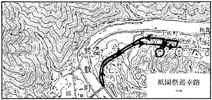 3 今の祇園祭り 昭和57年の7月17日はあいにくの天気で、朝から今にも降り出しそうであった。八坂神社の馬場先の参道入口に、丸太で組んだ鳥居に御神燈がかかげられ、境内入口の石鳥居まで約100mの馬場に〆縄が引きめぐらされ、両側に幟が数本はためいていた。(この“馬場づくり”は7月10日に行われる。)