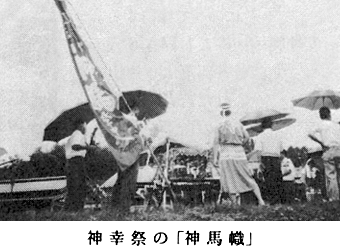2 昔の祇園祭り 往時の祇園祭りの盛況ぶりは、神社に掲示されている由緒書を見るまでもなく、年輩の人なら誰でも、なつかしさをこめて生々しく語ってくれる。 祭礼日には、氏子はもとより桑野、新野、加茂谷、相生など近郷近在の村々から馬を引きつれ群参し、神輿の供奉に参加した。なかには遠く海部や、勝浦・国府などからもやってきて、その数、盛時(大正未頃)には2〜300頭に及んだという。 それらの馬のために、氏子の若連(青年)が馬着配置事務所を設けて、宿泊所の斡旋をした。引きうけた氏子の家々では、繋き場を特設し、“まぐさ”の世話や、その引率者(1頭に2〜3人)の接待に大忙しであった。 7月16日が宵宮で、土佐町や和食の商家では、カマスで“ひきがえる”をつくるなど、思い思いの題材で“ダシ”をつくった。また煙火の奉納もあって、町筋には夜店が立ち並び、和食―土佐町―小仁宇の通りは人で埋まった。 17日は本祭り。神輿が渡御する土佐町和食にかけての巡幸路は、お供のダンジリや供奉馬でごったがえした。先頭馬が巡幸供奉をおえて戻ってくるころも、まだ後続の馬が境内で足踏みをしていたそうだ。 戦時中、馬がだんだん減って食料事情も苦しくなり、戦後はついに当家の責任である当家馬さえ用意できなくなり、昭和40年代には神馬の絵を描いた幟がお供するようになり、今日に至っている。