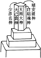 の2社は、五神の配列が天照大神の右(向って)に大己貴神、左に倉稲魂神となっており異例と思われる。なお、中央の天照大神が北面する形が多いのは、日の神を拝する形とも思われるが、なかには東や西に向いているのもあって、地形的な配慮があるようだ。