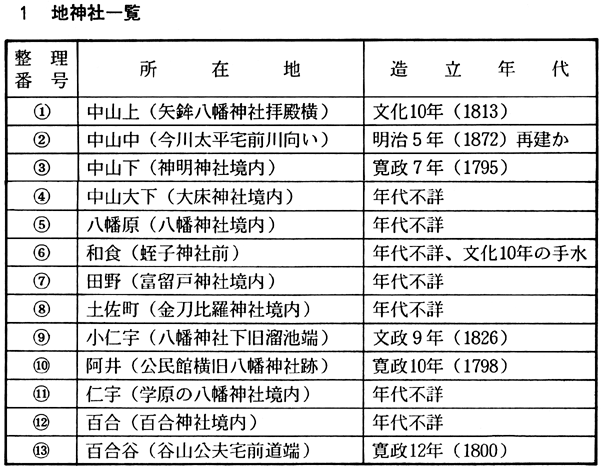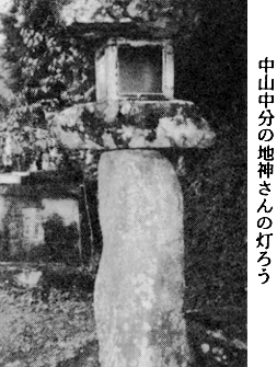 の氏子である中山中分には、「天保4年(1833)の手板」があり、それに記された講組名によって今も19戸の氏子(手板の家号は現在と同じ)が交替で、毎月1日・15日・28日に地神社の灯籠に灯明をあげている。社日祭には全氏子が参列し(神職は招かず)、長老が祝詞をあげ、各家から酒肴を持ち寄り直会をする。 イ 3