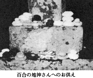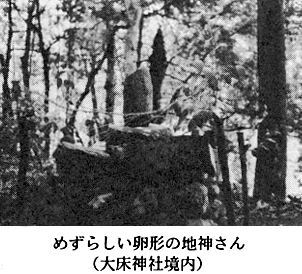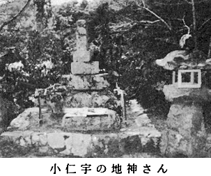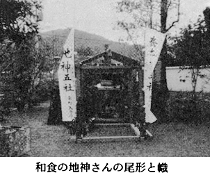 3)社日祭について 春秋の社日(中日に最も近い戊の日)が地神社の祭日で“お地神さん”とよばれている。かつてこの日は、土をいじくったり田んぼヘ入ってはならぬというタブーがあった。今そのタブーはだんだんくずれつつあるが、どことも社日祭は厳修されている。 前日に当家が地神社の周辺を清掃し、四隅に青竹(1