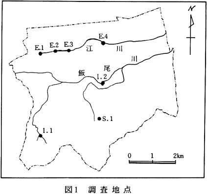 2.調査地点と調査方法 調査は、図1に示した各地点で行った。江川の源は鴨島町西麻植の吉野川遊園地西隅にある。吉野川からの伏流水が湧き出す湧水池がその源流になっている。鴨島町を東に貫流し、名西郡西高原で吉野川に流入する全長約8.8kmの小河川である。流域には、住宅が多く、その排水の流入等により、水の汚濁がすすんでいる。