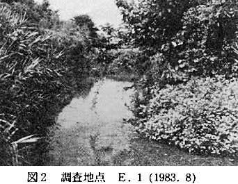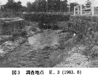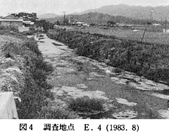 この地点も、水が清例であれば、流水性の水生昆虫が多く生息すると思われる所である。E.4(鴨島町喜来、清美橋)は、石礫底の平瀬が見られる地点である。家庭排水等の流入により、かなり汚濁がすすんでいる。